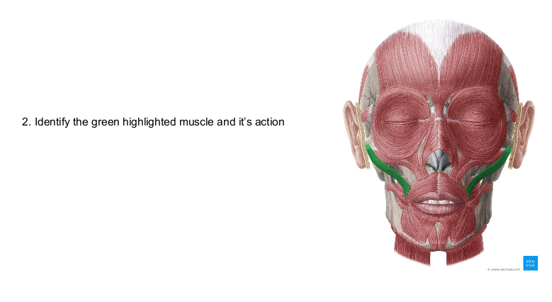Zygomaticus (major); pulls corners of mouth up and out in smiling