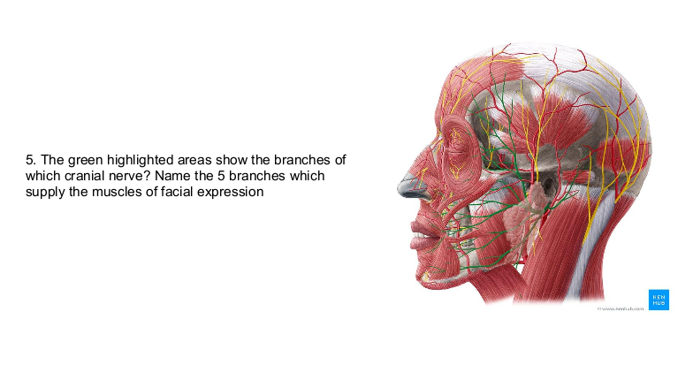 Facial nerve; temporal, zygomatic, buccal, marginal mandibular, cervical