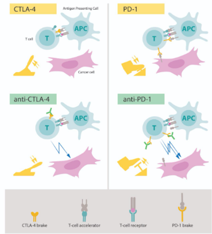PD-1 är ett checkpointprotein på T-celler. Den fungerar normalt som en off-switch och hindrar då T-cellerna från att attackera andra celler i kroppen. Monoklonal antikropp kan binda antingen PD-1 eller PD-1-ligand och kommer då boosta immunsvaret mot ex cancerceller