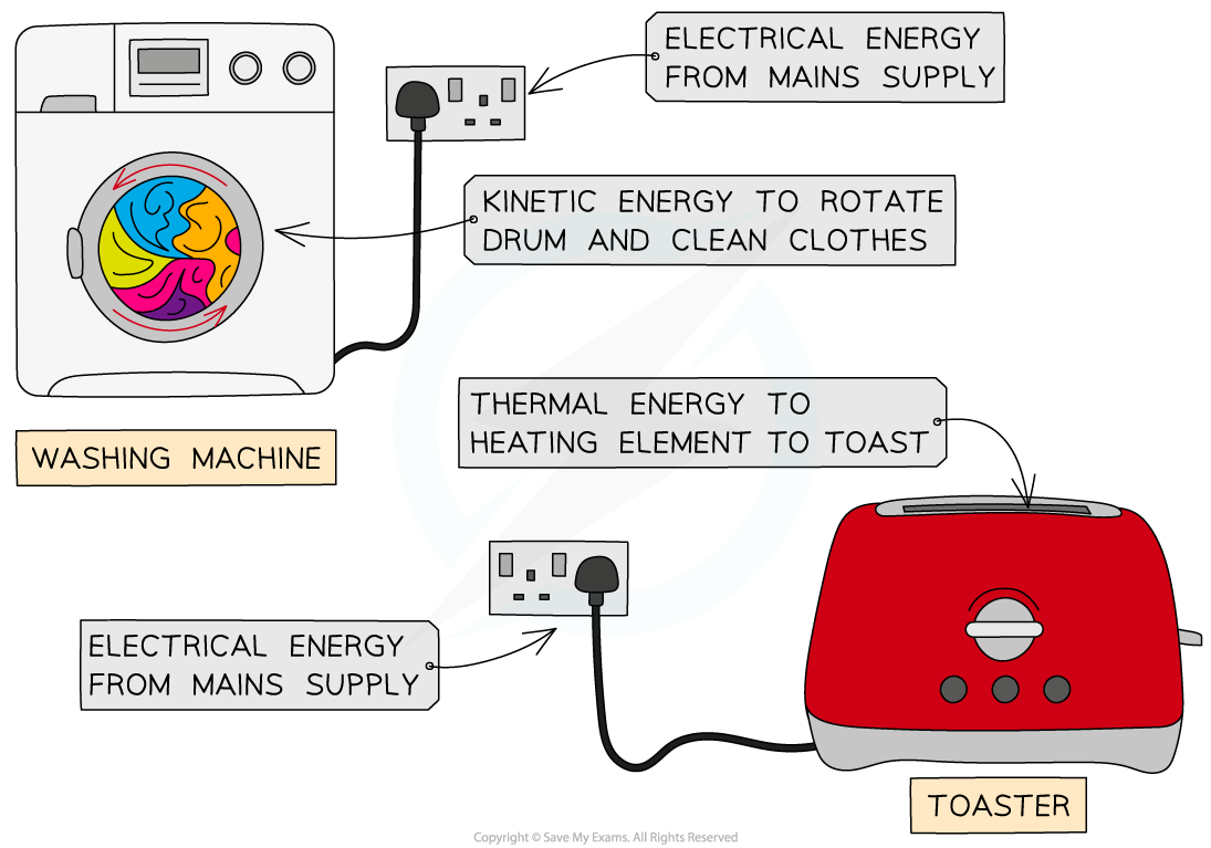 All electrical appliances transfer energy from one store to another, for example chemical energy in the fuel in power stations. This is transferred into kinetic energy in a fan or heat energy in a cooker.
