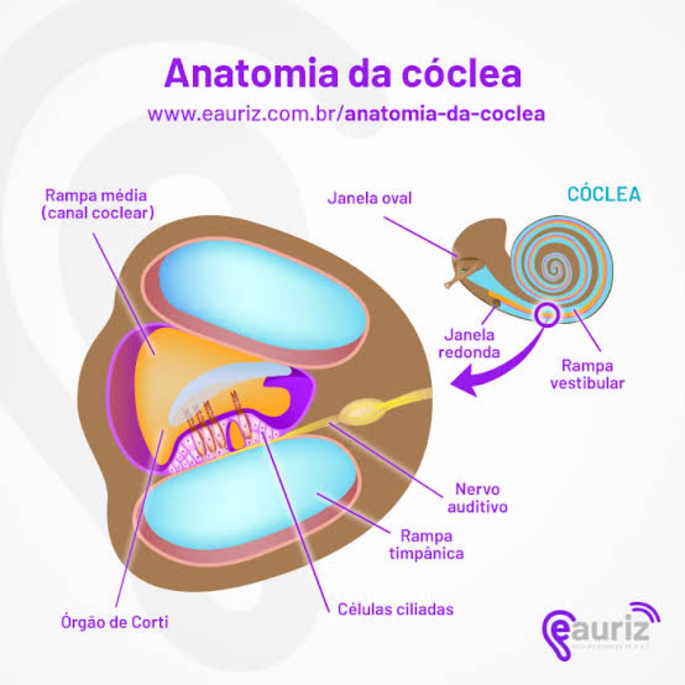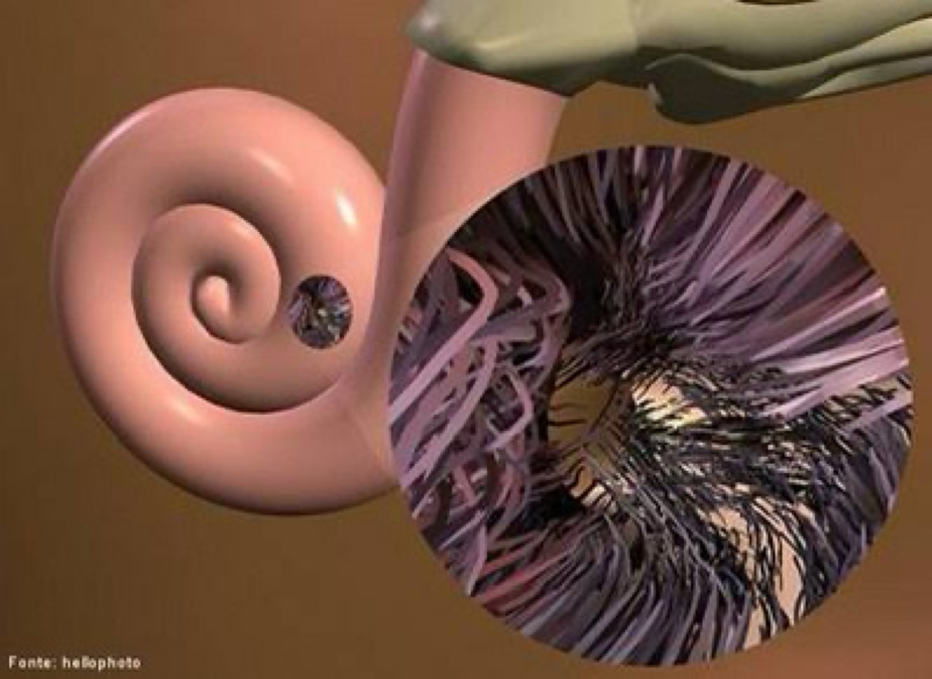 A cóclea é uma estrutura em forma de espiral que converte ondas sonoras em impulsos nervosos.