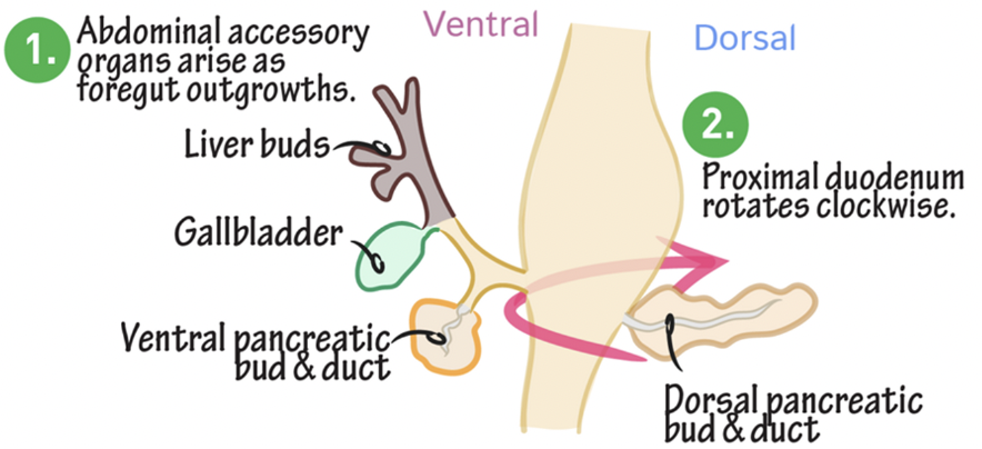 During the development of the pancreas, which direction does the proximal duodenum rotate?