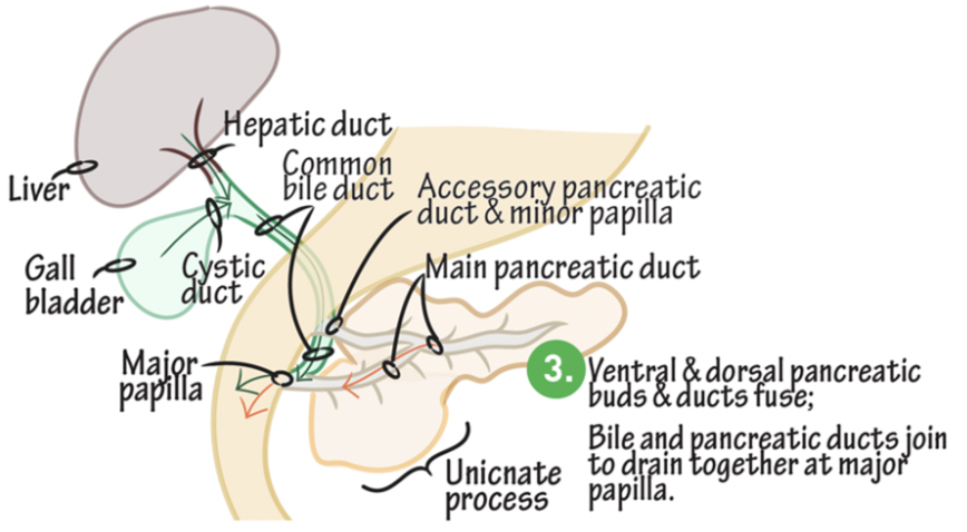 What happens to the dorsal and ventral pancreatic ducts after 11 weeks?