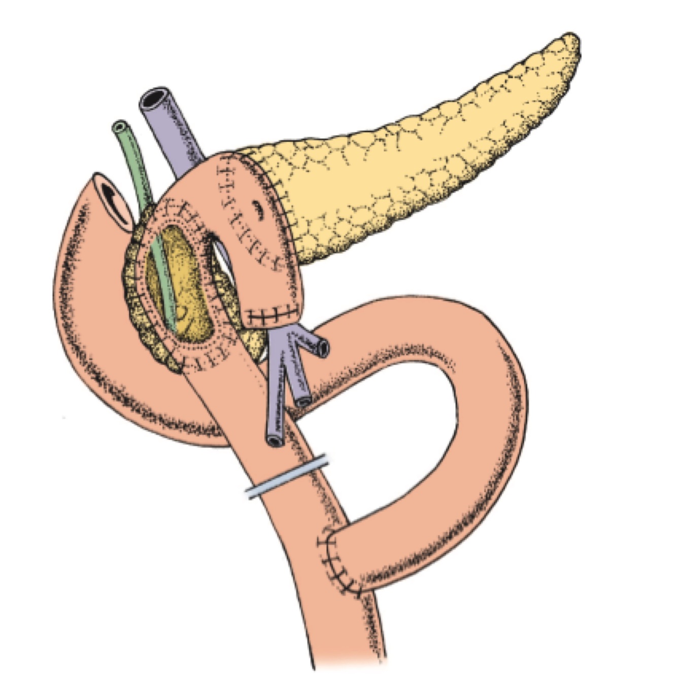 Blumgart: “a dissecção do pâncreas é feita a nível da veia porta, onde a cabeça é escavada enquanto o duodeno é preservado com uma fina camada de tecido pancreático. Caso o ducto biliar esteja obstruído, pode ser aberto para uma anastomose interna. A reconstrução inclui uma alça jejunal em Y de roux com duas anastomoses”: pacreatectomia : segundo o medcurso “mediopancreatectomia”.
