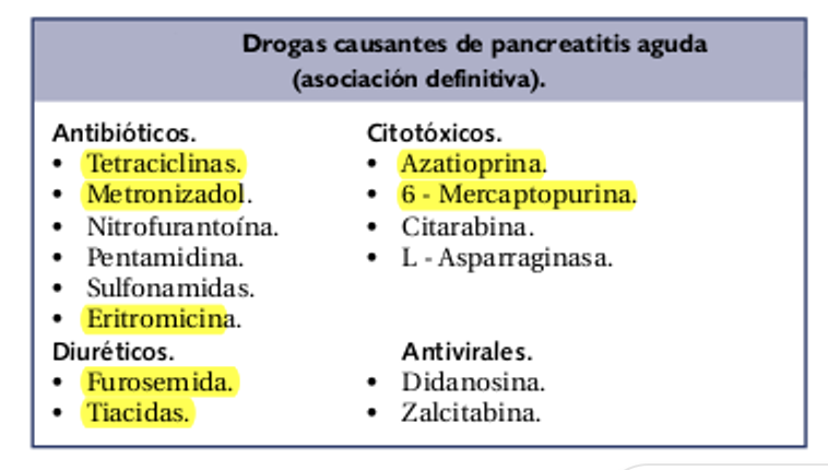 Litiasis biliar, alcoholismo (20%), traumática (post CPRE)