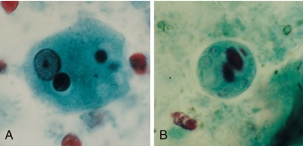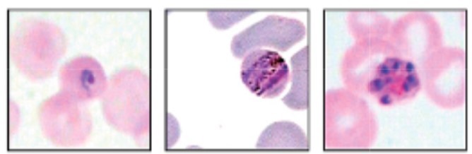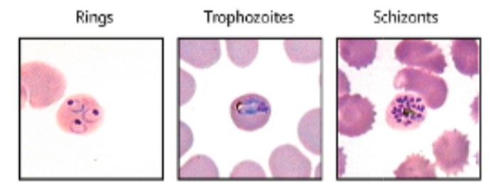 (L = trophozoite w/ ingested RBCs; R = cyst)