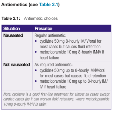 Cyclizine is a better first line antiemetic however should be avoided in patients with heart failure as it can lead to fluid retention