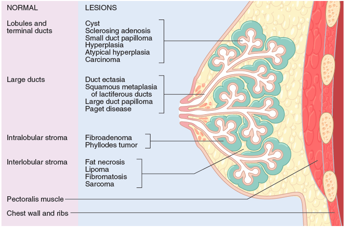 Palpable masses of the breast are most commonly due to what 3 etiologies?