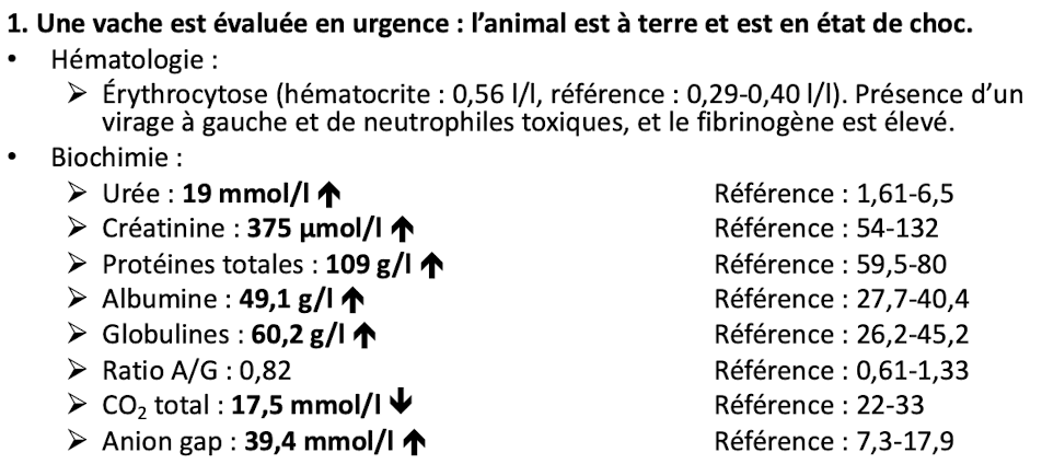 Selon les signes cliniques, qu’est-ce qui semble le mieux expliquer l’augmentation de l’urée, de la créatinine, les PT, de l’albumine et des globulines ?