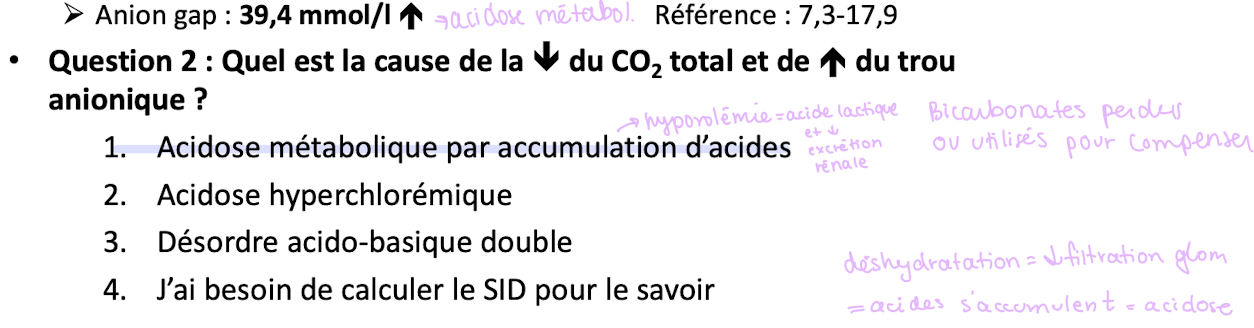 corps cétoniques, acides lactiques et acides circulant dans le sang sont moins excrétés par les reins (déshydratation) = augmentation de l’anion gap