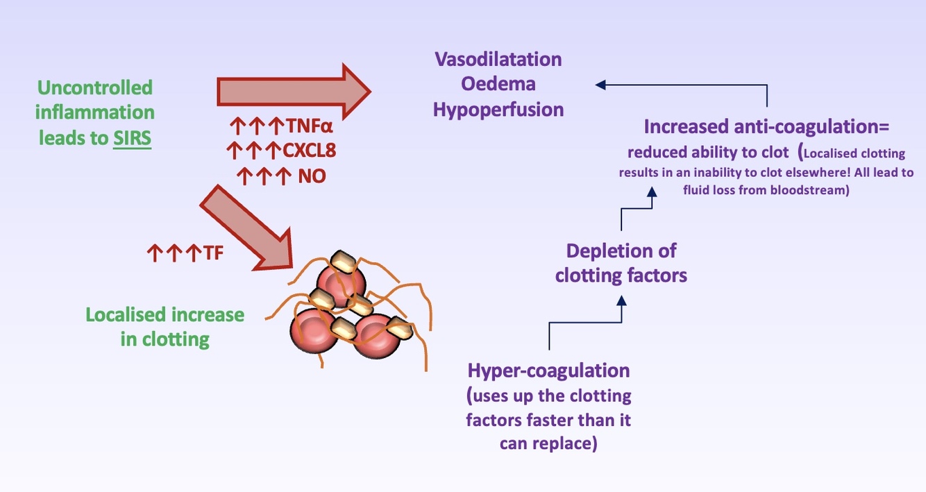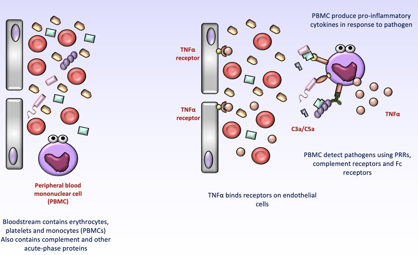 Activation of peripheral blood mononuclear cells (monocytes) + Large amount of pro-inflammatory immune products at the primary site leads to systemic signs of infection.