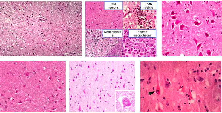 12-24 hrs: Red neurons (eosinophilic cytoplasm, pyknotic nuclei, and loss of Nissl substance)