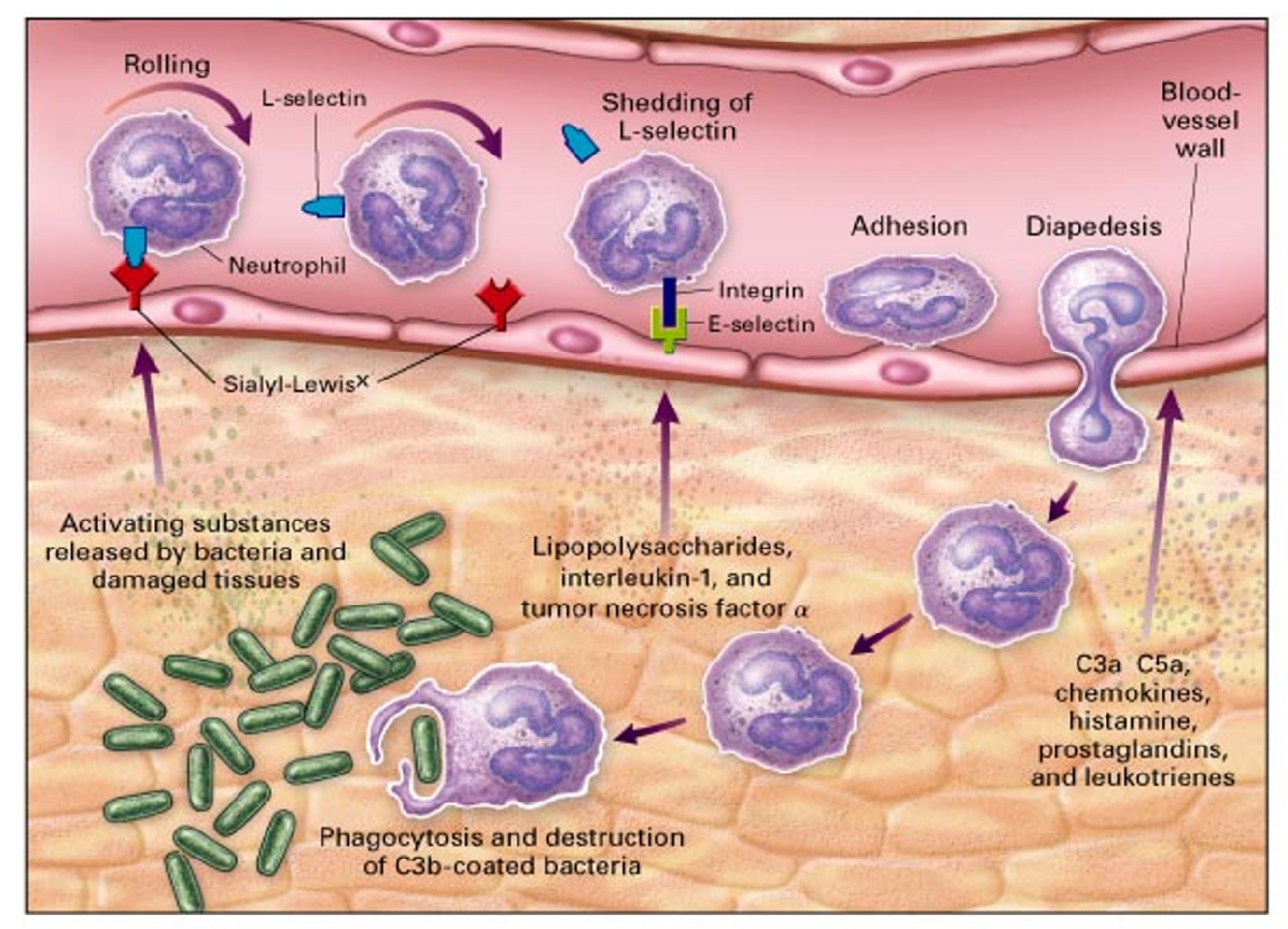 Neutrophil diapedesis, moves down chemotacctic gradient, phagocytosis