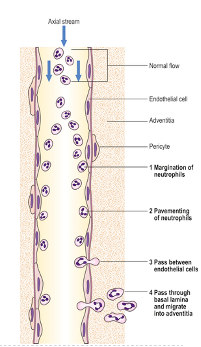 -Pass between endothelial cells, through basal lamina and into adventitia and tissue