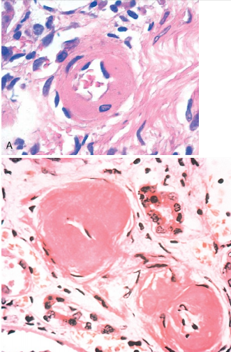 Hyaline arteriolosclerosis. The high pressure causes tissue injury and pushes serum proteins into the vessel walls. This can lead to kidney failure from decreased serum protein levels.