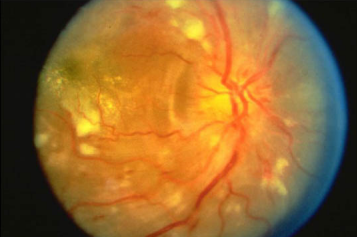 Retinopathy. Arterioles and blood supply in the retina thicken and narrow. Also note yellow exudates from vascular leakage.