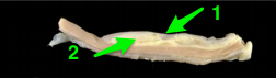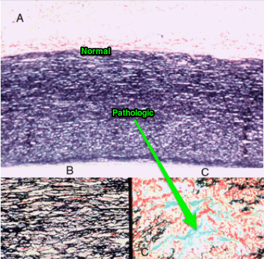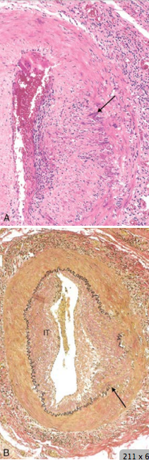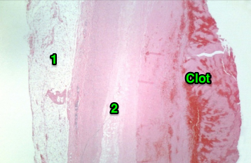 Early plaque. 1) Fibrous cap 2) lipid center.