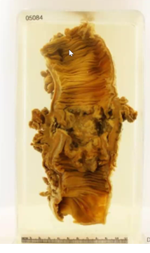 Yellow arrow – stricture – caecum and ascending colon is very narrow – dye is hardly making way through. Lumen very narrow.