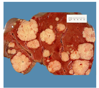Can see multiple large, pale, well circumscribed lesions. Centre is necrotic – soft and cheesy. High met load.