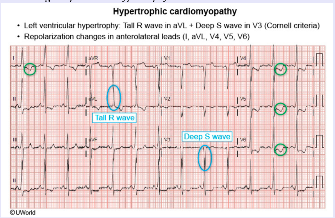 ECG changes indicative of hypertrophic cardiomyopathy include a tall […] wave in aVL and a deep […] wave in V3.
