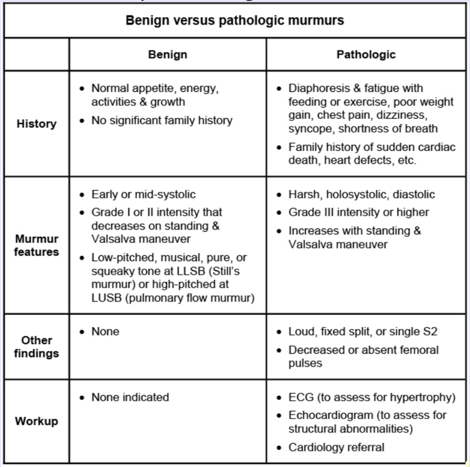 benign murmurs are typically early or mid-systolic grade I or II murmurs that decrease in intensity with standing or Valsalva