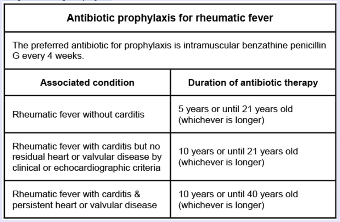 Continous antibiotic prophylaxis (e.g. IM benzathine penicillin G every 4 weeks)
