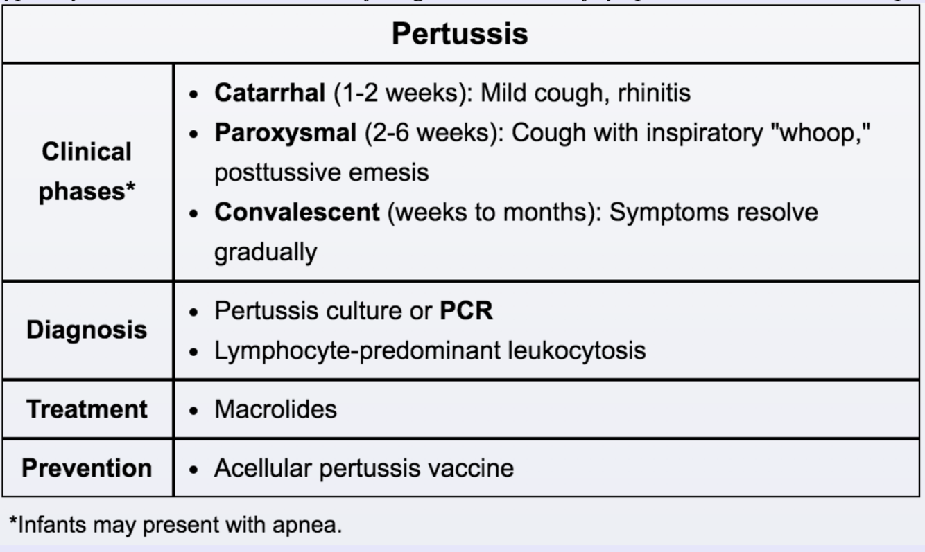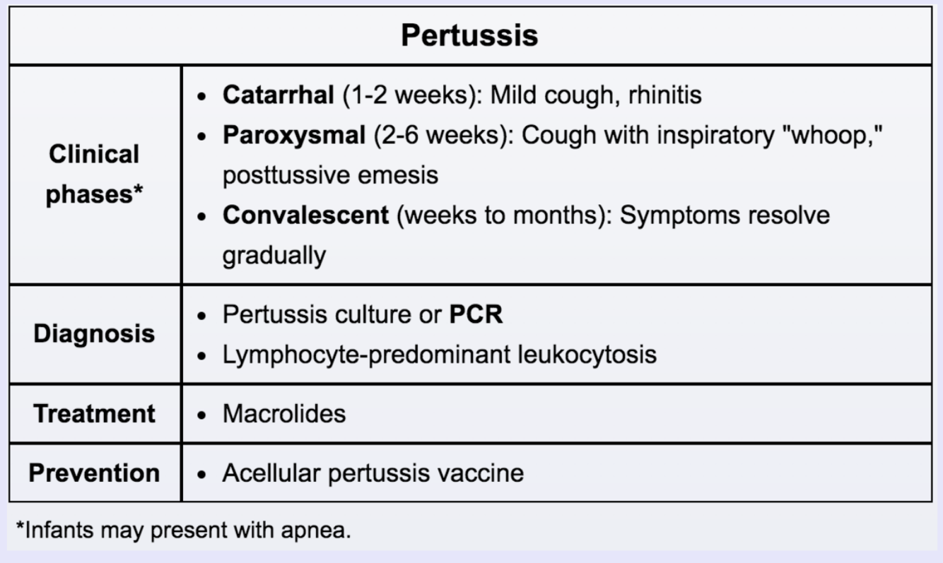 After an initial catarrhal phase, pertussis progresses to a paroxysmal phase, which is characterized by a “whooping cough”, often with posttussive emesis