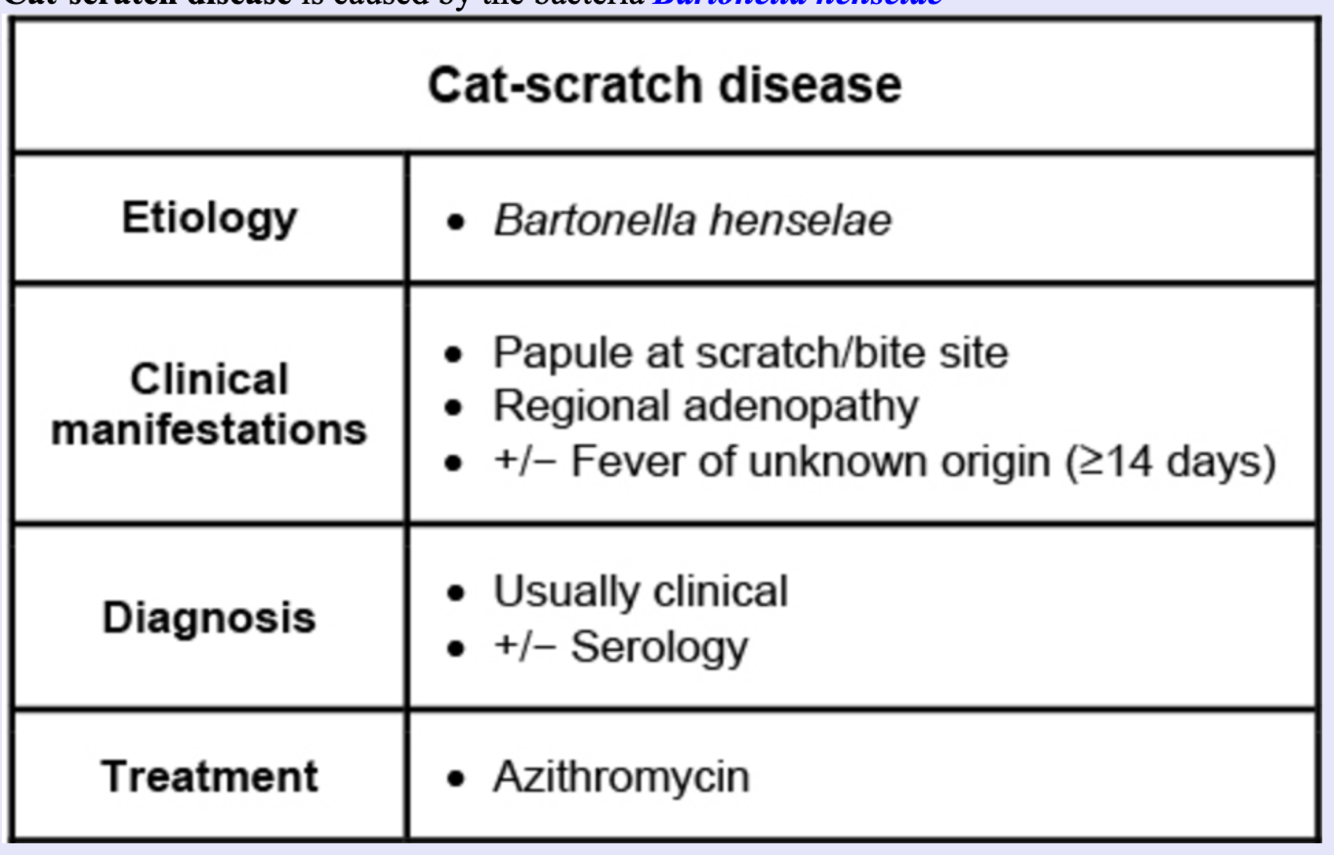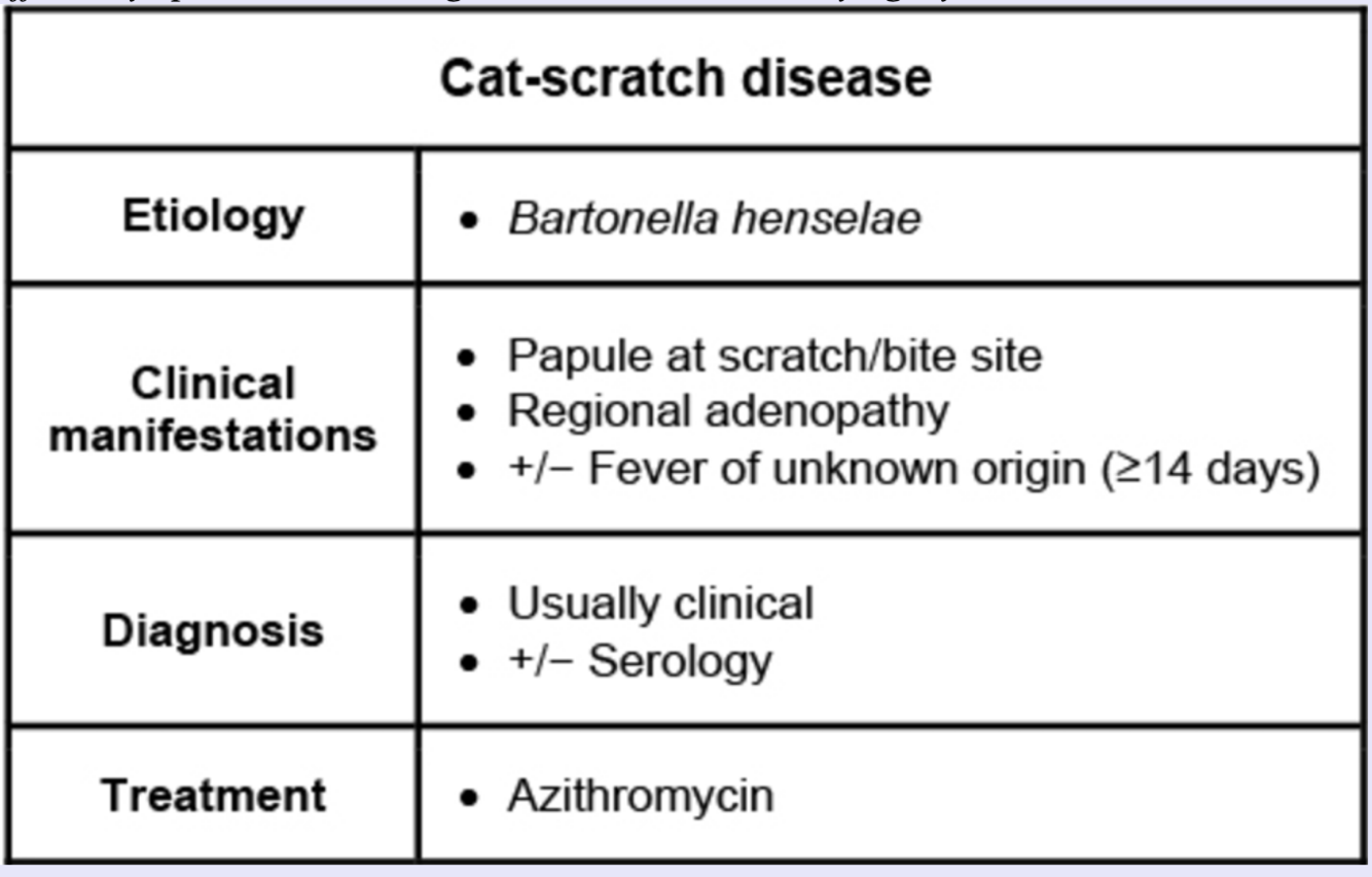 Cat-scratch disease often manifests as a localized papule followed by regional tender lymphadenopathy that develops in the subsequent 1 - 2 weeks.