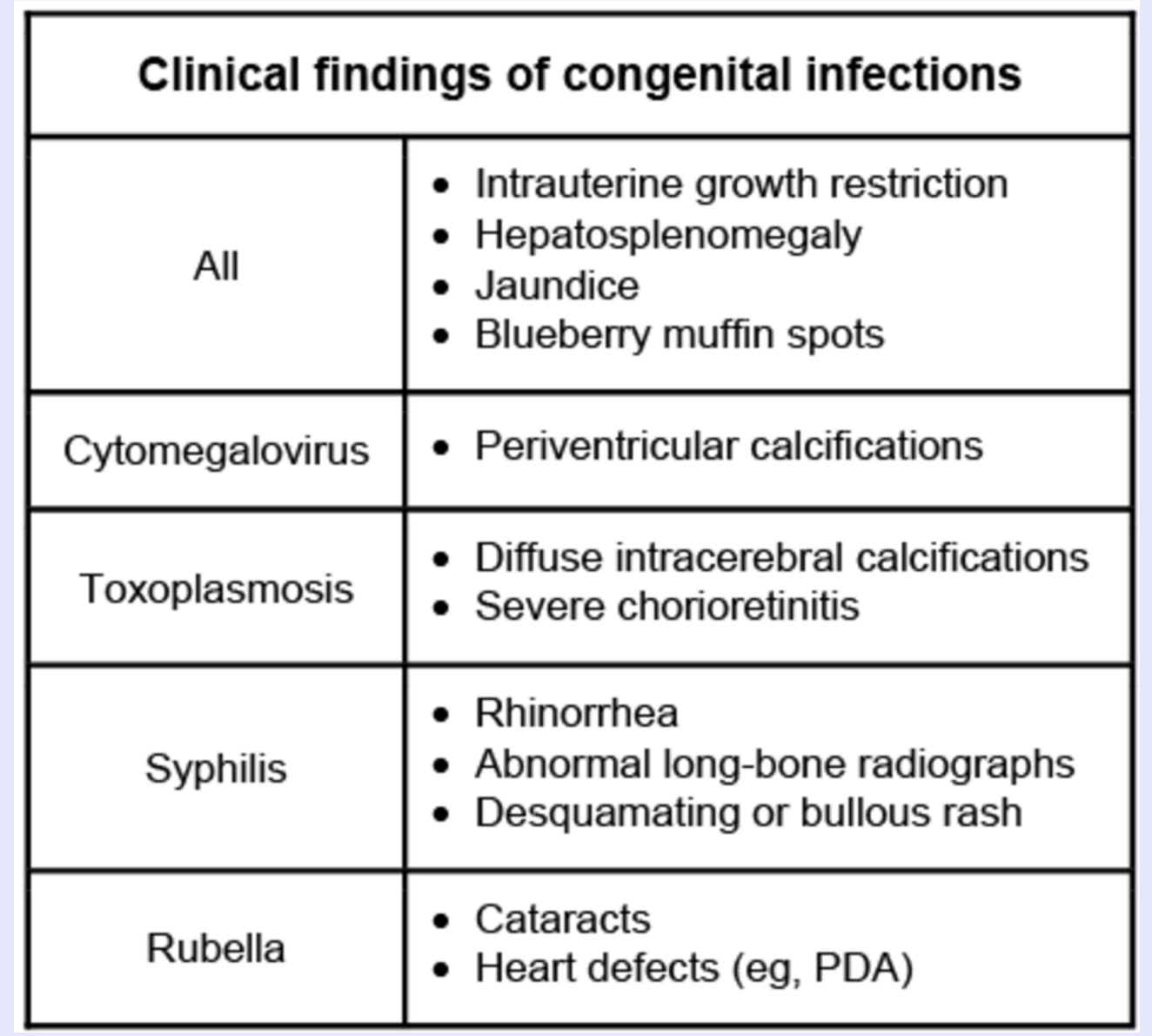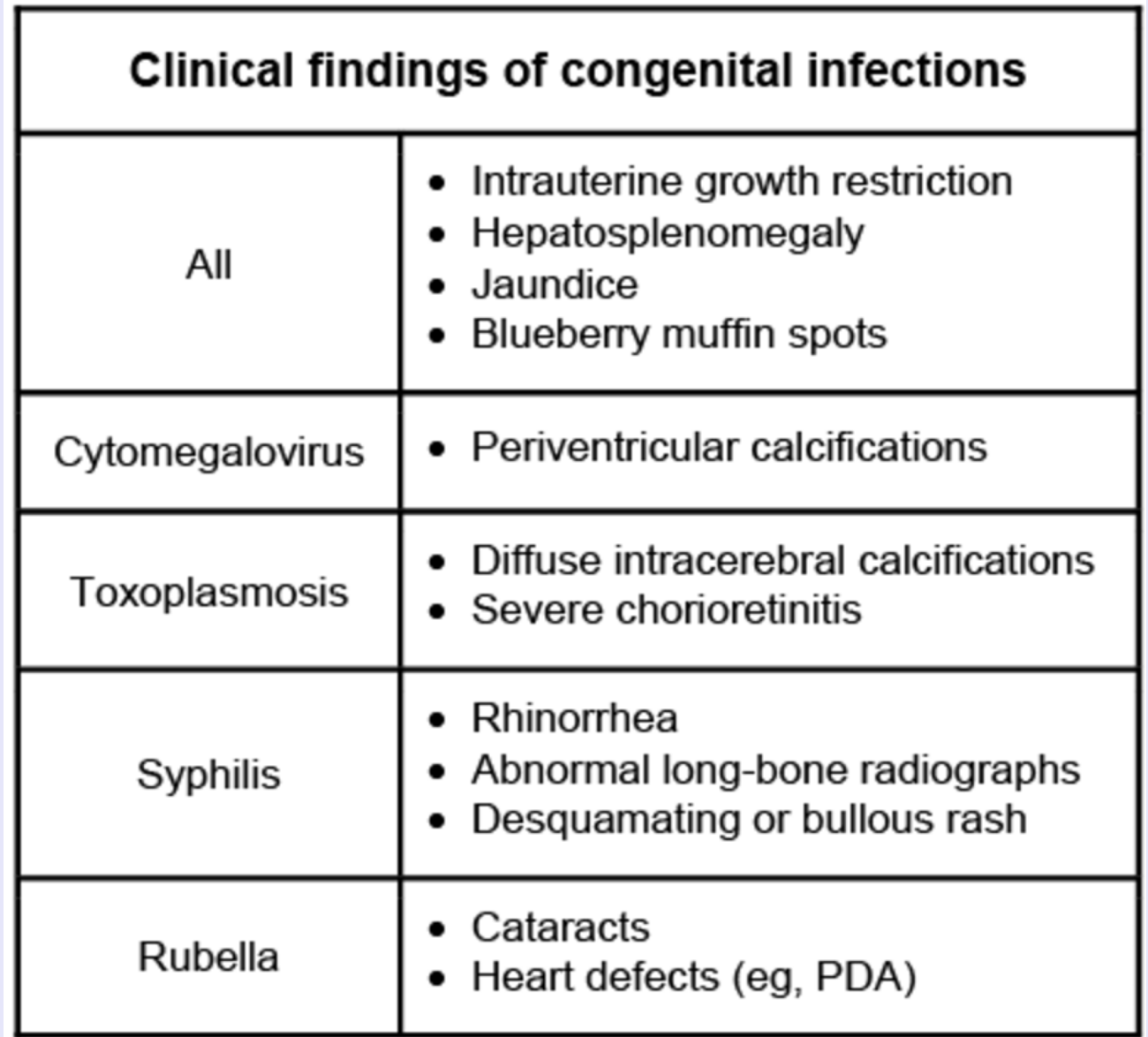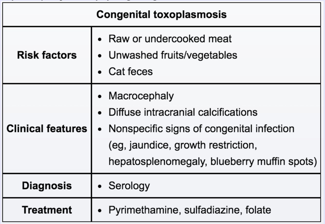 versus congenital CMV, which is associated with periventricular calcifications; diagnosis is confirmed by the presence of infant IgM or IgA