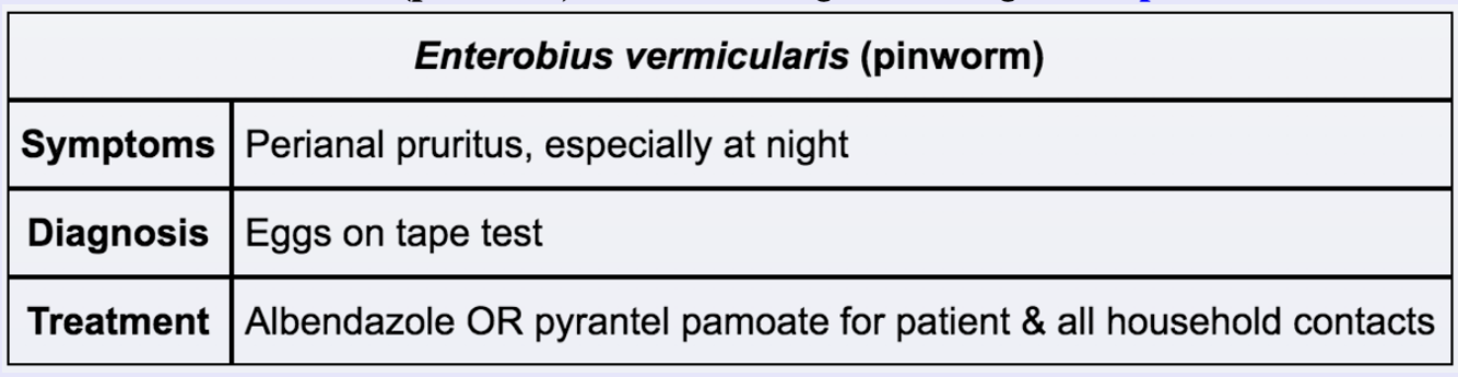 Enterobius vermicularis (pinworm) infection is diagnosed using the “tape test”.