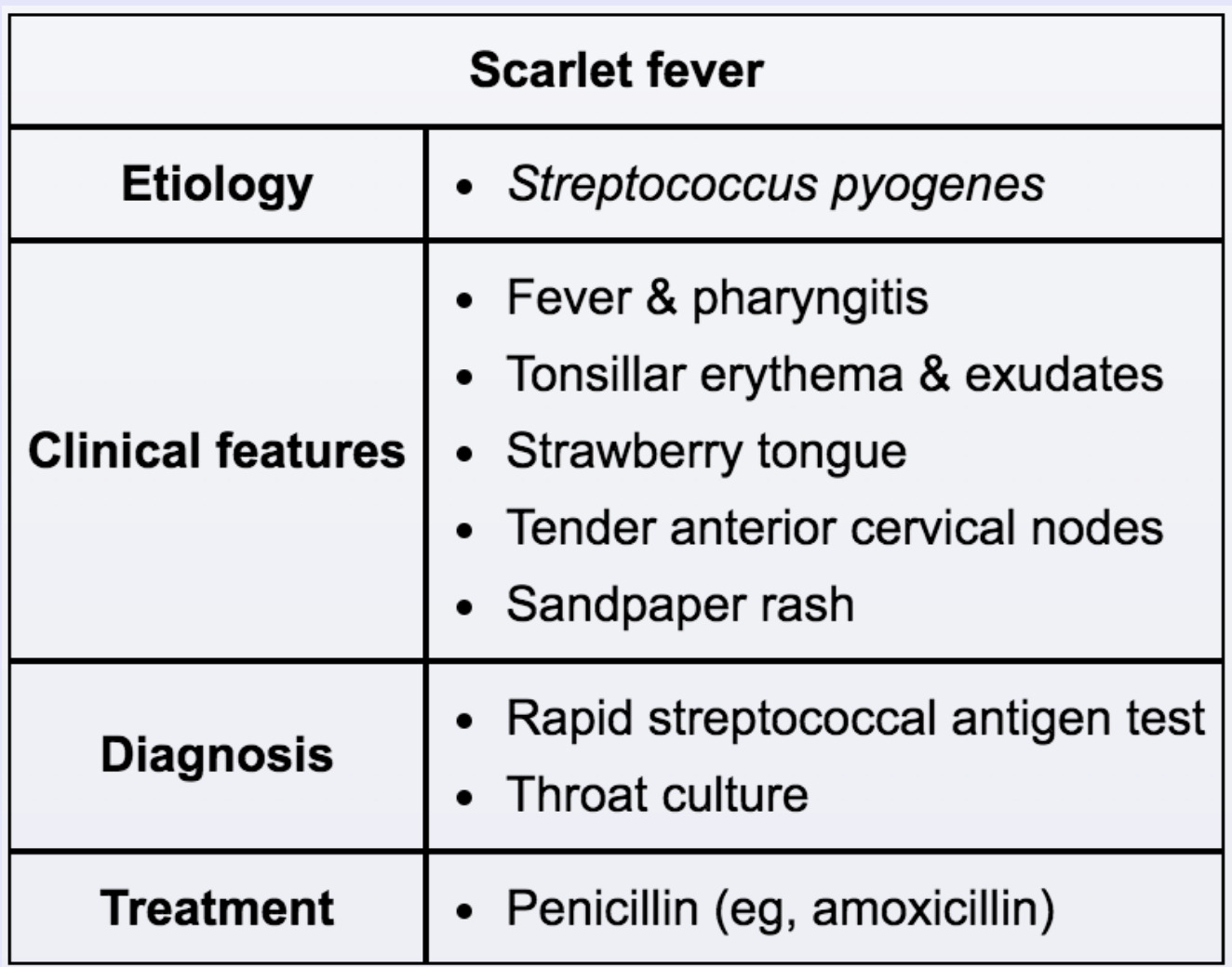 Manifestations of scarlet fever include fever, sore throat, circumoral […], “sandpaper” rash, and strawberry tongue.