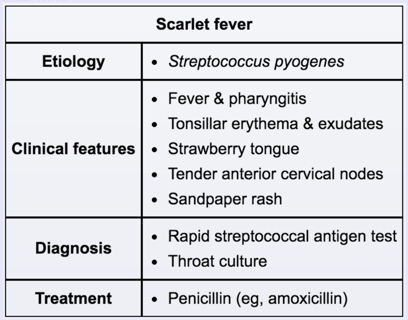 Manifestations of scarlet fever include fever, sore throat, circumoral pallor, “[…]” rash, and strawberry tongue.