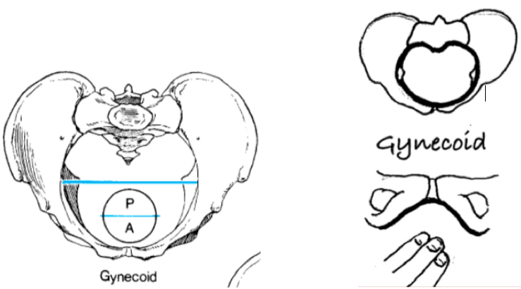 Describe the gynecoid pelvis according to Caldwell-Moloy and its clinical significance