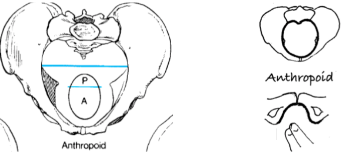 Describe the anthropoid pelvis according to Caldwell-Moloy and its clinical significance