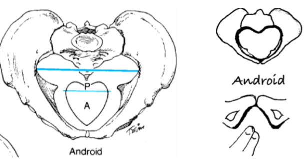 Describe the android pelvis according to Caldwell-Moloy and its clinical significance