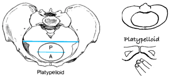 Describe the platypelloid pelvis according to Caldwell-Moloy and its clinical significance