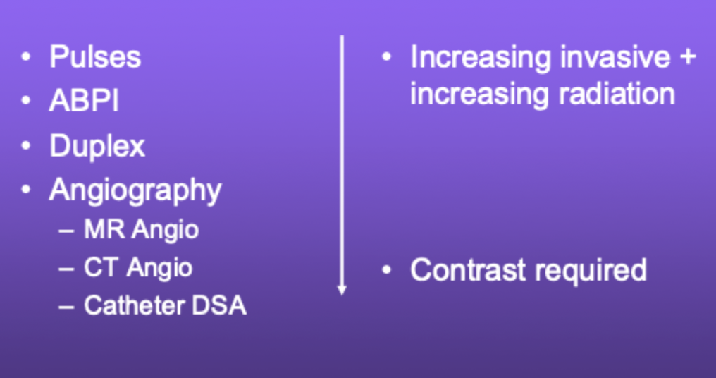 Symptoms: Constant ishcemic pain (inc rest/night), ulcers and gangrene (lack of damge healing due to ischcaemia)