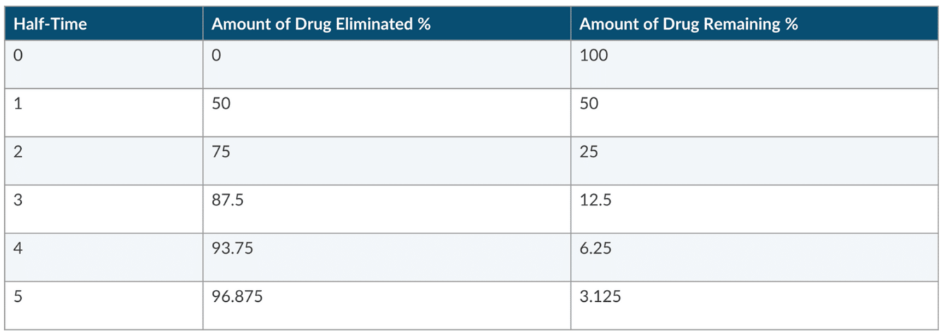 After three half lives, what percentage of a drug is removed?
