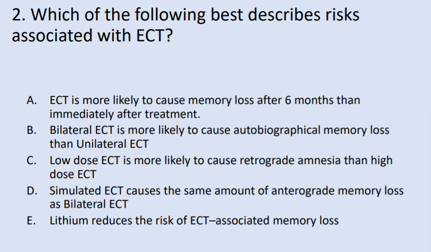 Effect on cognition (10%) - usually retrograde and enterograde memory so events immediatedly before and after ECT and most patients recover fully after 6 months