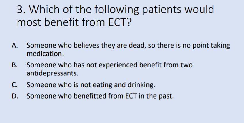 Inducing a seizure but modified as using anaesthetic and muscle relaxant. This anaesthetic is at high dose but very short lasting. Muscle anaesthetic means that it won’t be a full convulsive seizure.