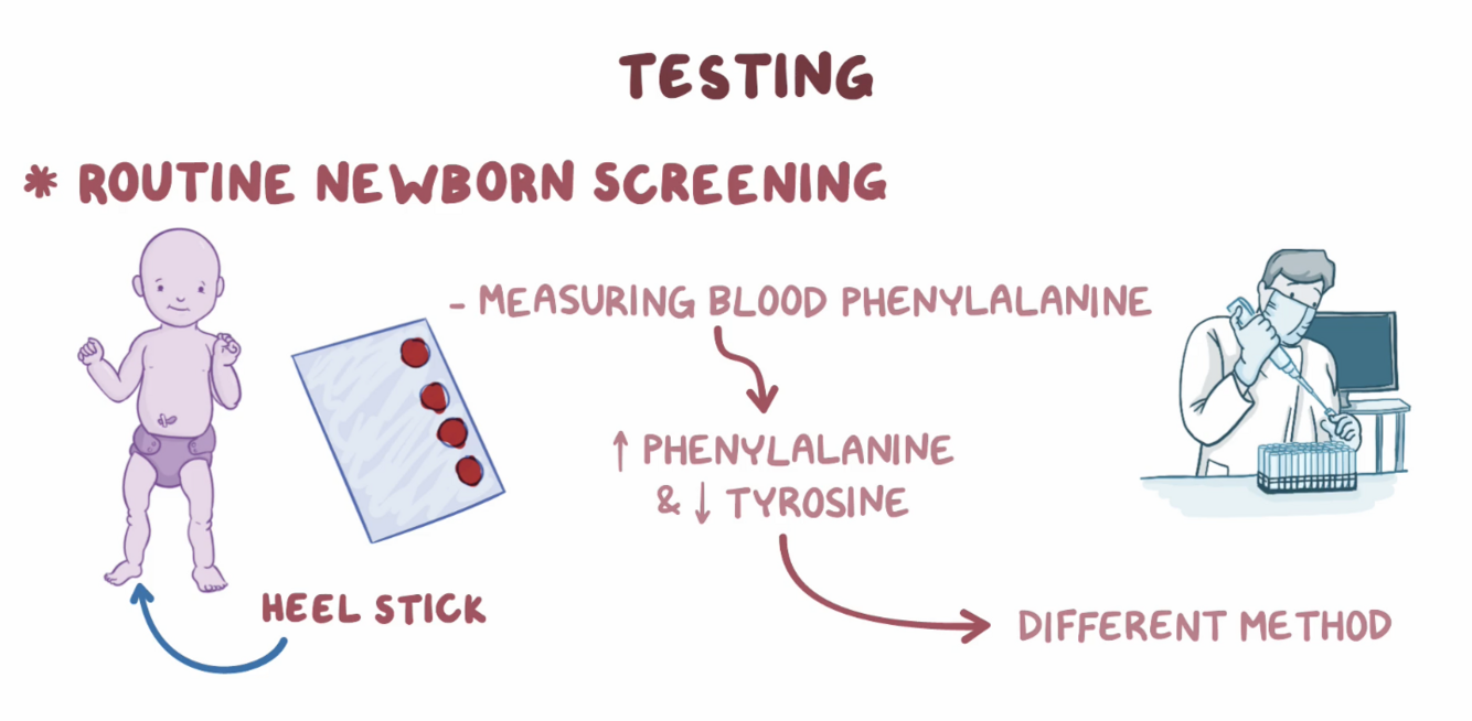 - blood levels of phenylalanine (>120 uM) and tyrosine are measured