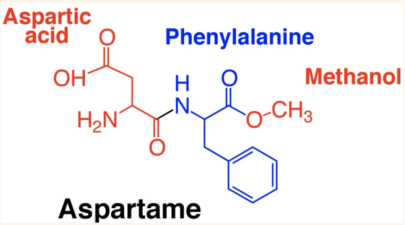 - aspartame = aspartic acid, methanol and phenylalanine