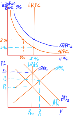 Increase in AD —> reduces u/e and causes inflation (move along SRPC) Voluntary u/e suffer from money illusion