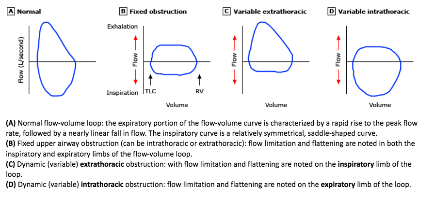 Patterns on spirometry with obstructive (extrathoracic & intrathoracic, fixed & variable) diseases