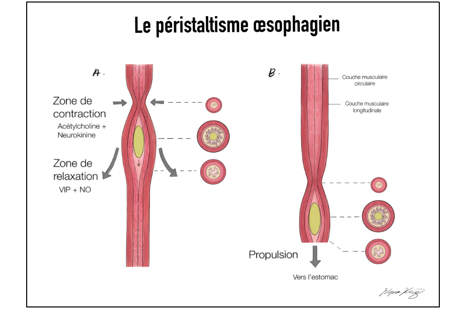 L’oesophage reçoit le bolus alimentaire de la bouche et le transporte à l’estomac grâce aux mouvements péristaltiques de ses muscles striés, situ.s dans le tiers supérieur, et de ses muscles lisses.