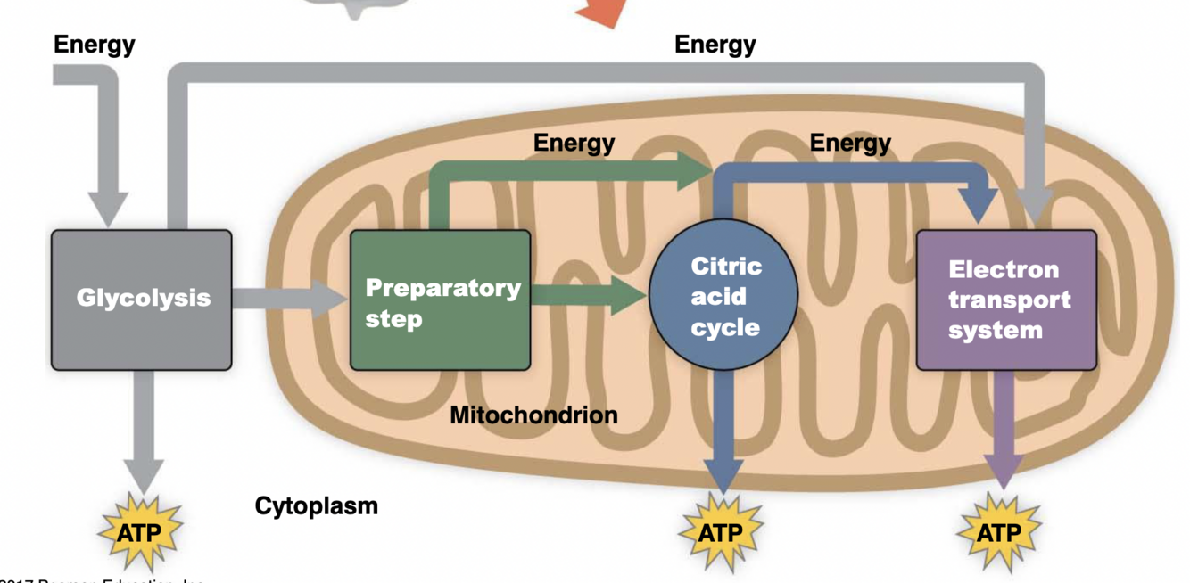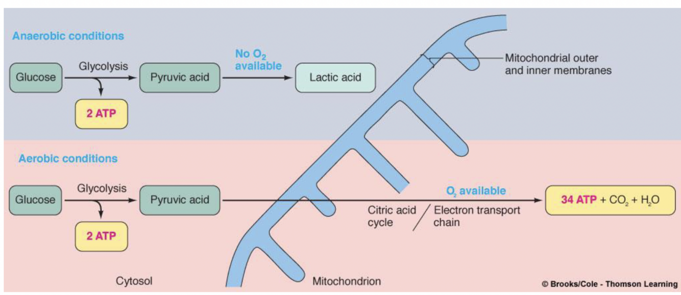 * Anaerobic (glycolysis) – only yields 2 ATP