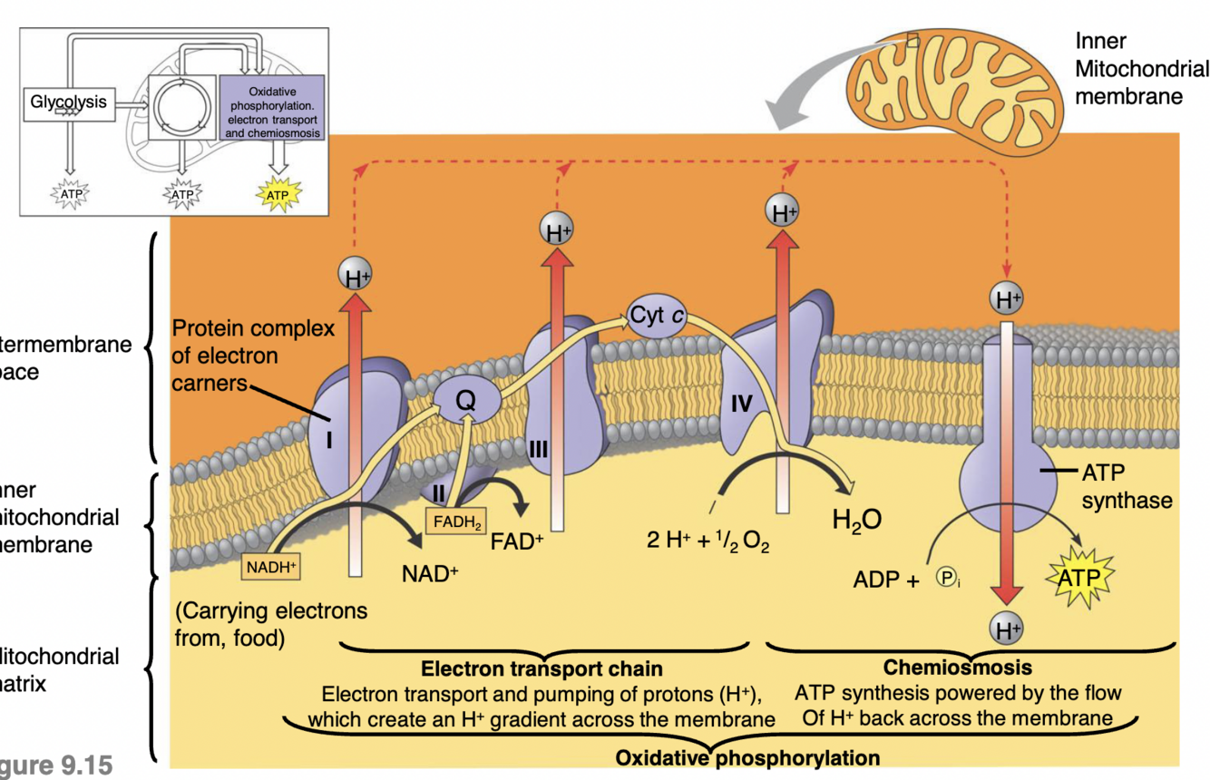 NADH and FADH2 are delivered to the inner mitochondrial membrane. cytochrome proteins, hydrogen pumps allow them to pass inside