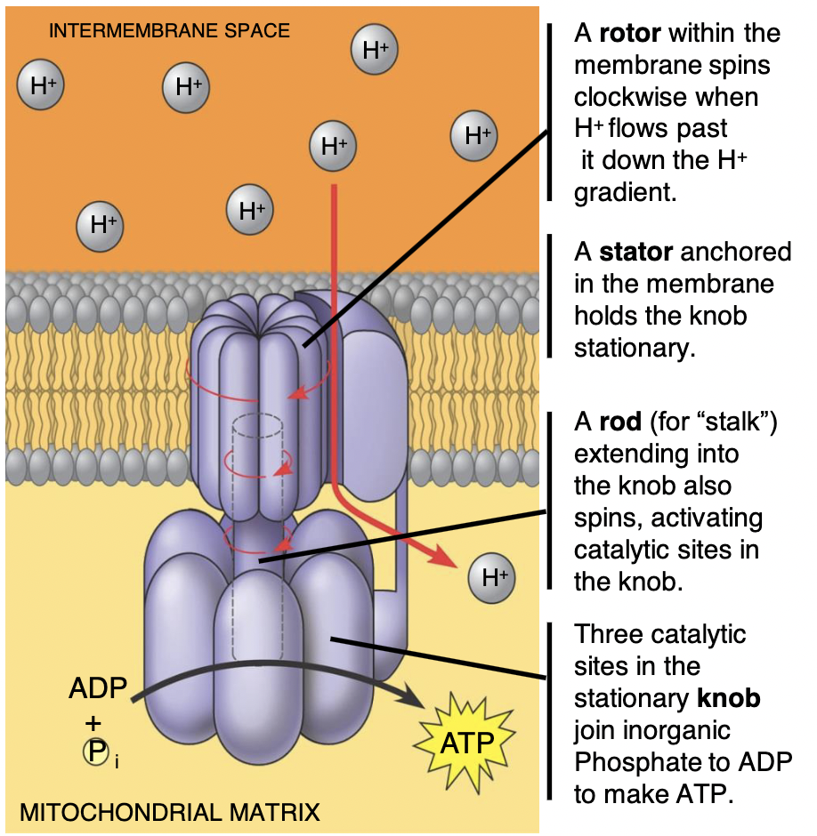 because of the concentration gradient, Hydrogen wants to come in, which powers the rotor system and allows for phosphate to be put on ADP