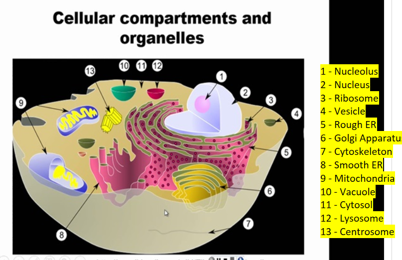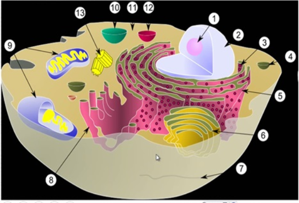 The Golgi is a complex of vesicles and folded membranes within the cytoplasm of most eukaryotic cells, involced in secretion and intracellular transport.