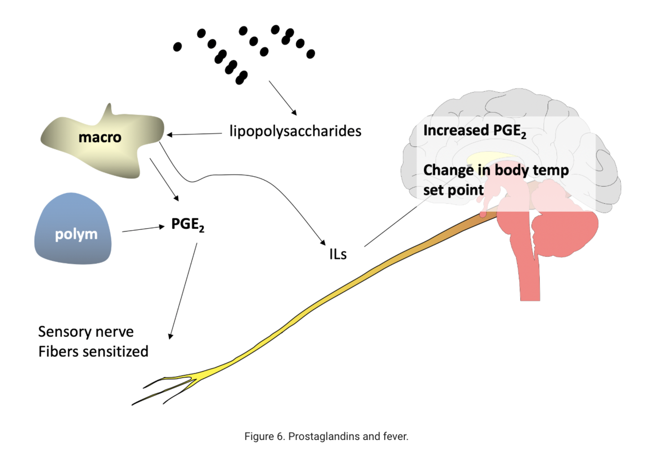 Bacterial lipopolysaccharides act as pyrogens – causing the release of leukocyte pyrogens – leading to increased PGE2 synthesis in the hypothalamus – changing set-point for body’s temp regulation